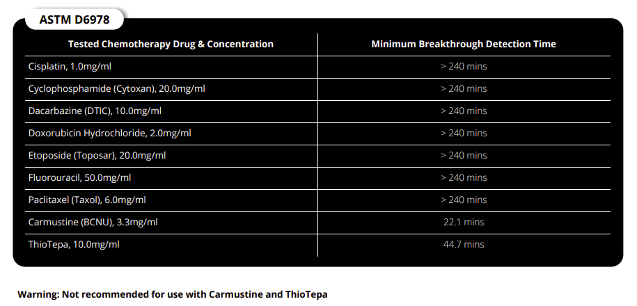 Gloves used as protection barrier against exposure to chemotherapy drugs should be selected specifically for the drug variants being used. Users are responsible to determine the safe use of gloves for chemotherapy treatment. These gloves are meant for single and short-term usage only.